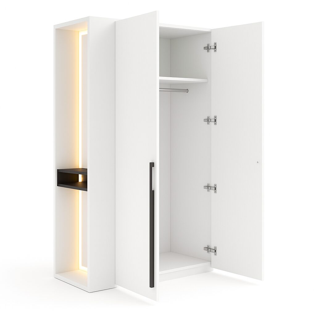 Innen überzeugt der Schrank mit einer praktischen Aufteilung – inklusive Kleiderstange, Ablagefach und großzügigem Stauraum für Kleidung, Schuhe und Accessoires. Das offene Seitenelement mit beleuchtetem Spiegel bietet nicht nur zusätzliche Funktionalität, sondern auch Platz für dekorative Akzente.